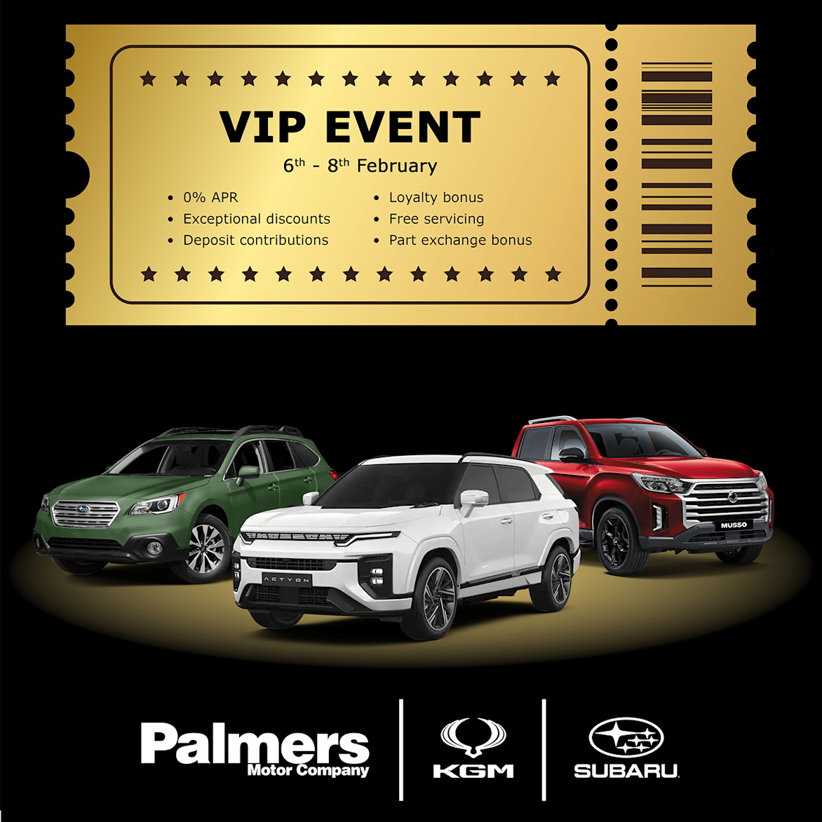 From February 6th - 8th Palmers is offering exlusive deals on its KGM and Subaru range, there is only a short time to seize this exclusive opportunity to upgrade your vehicle.